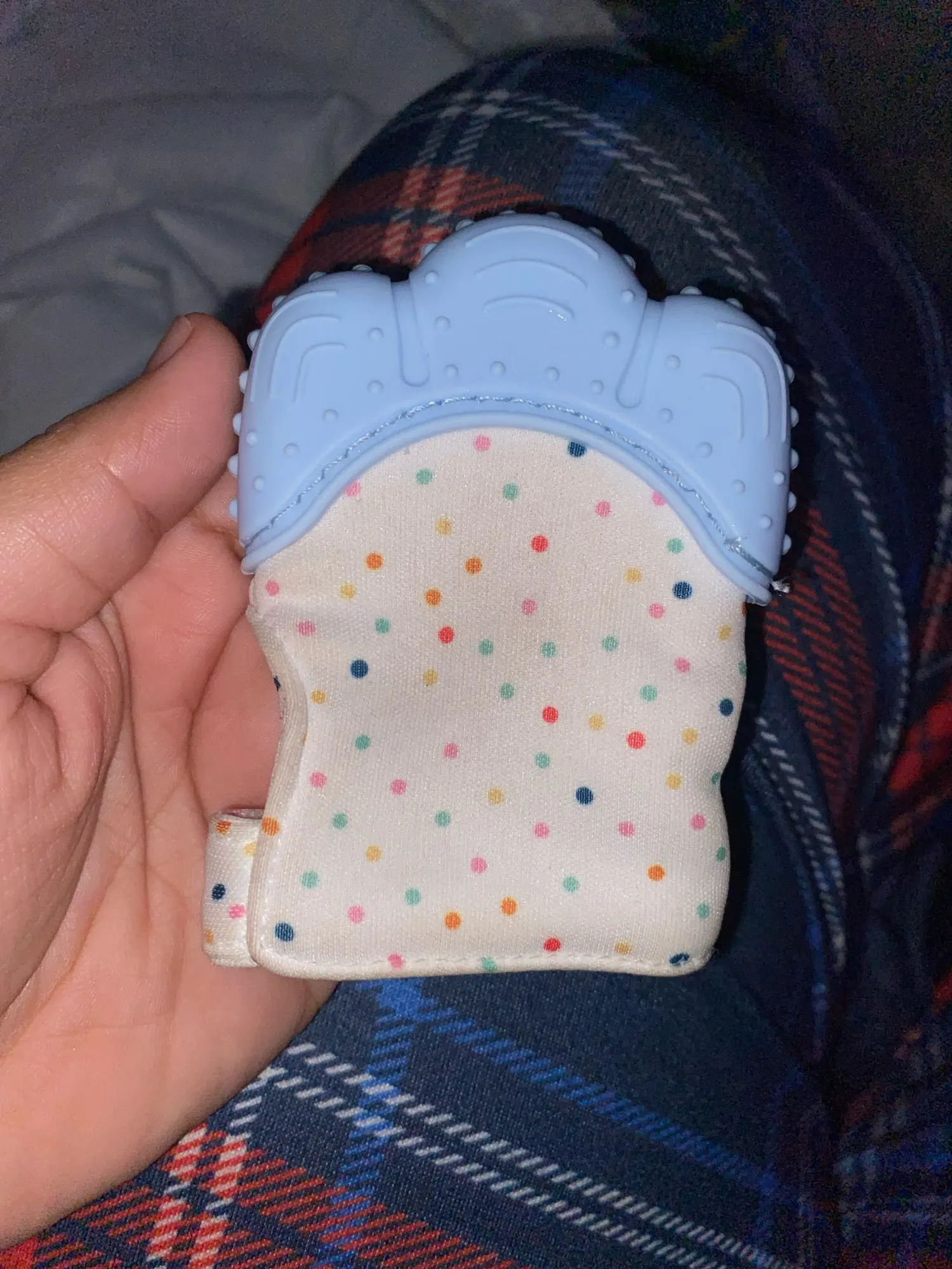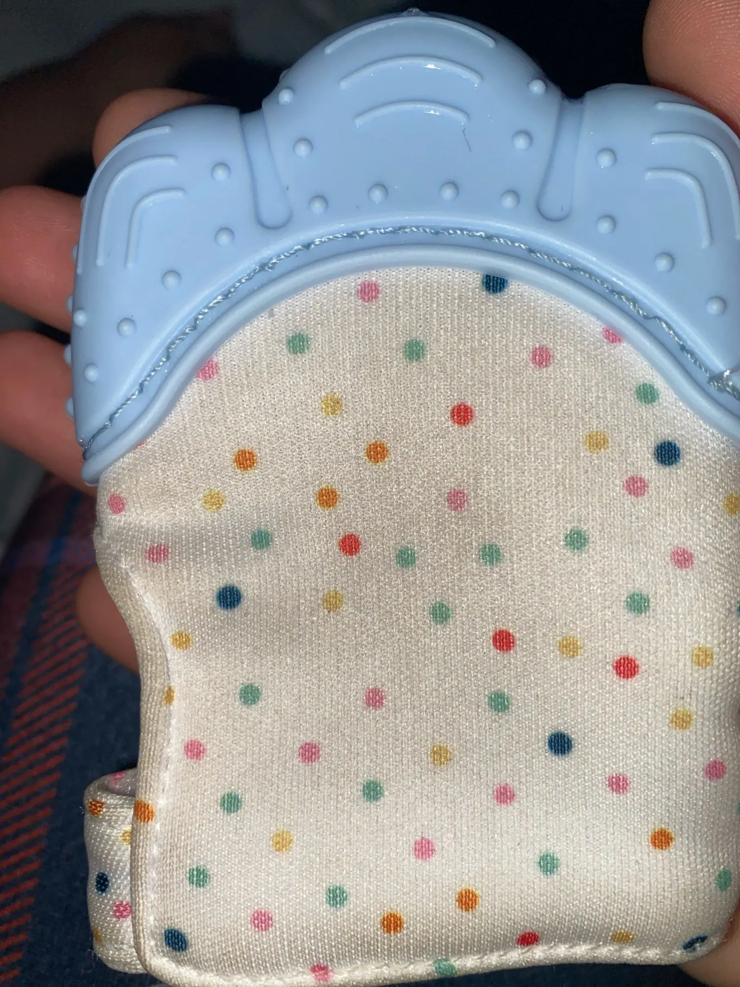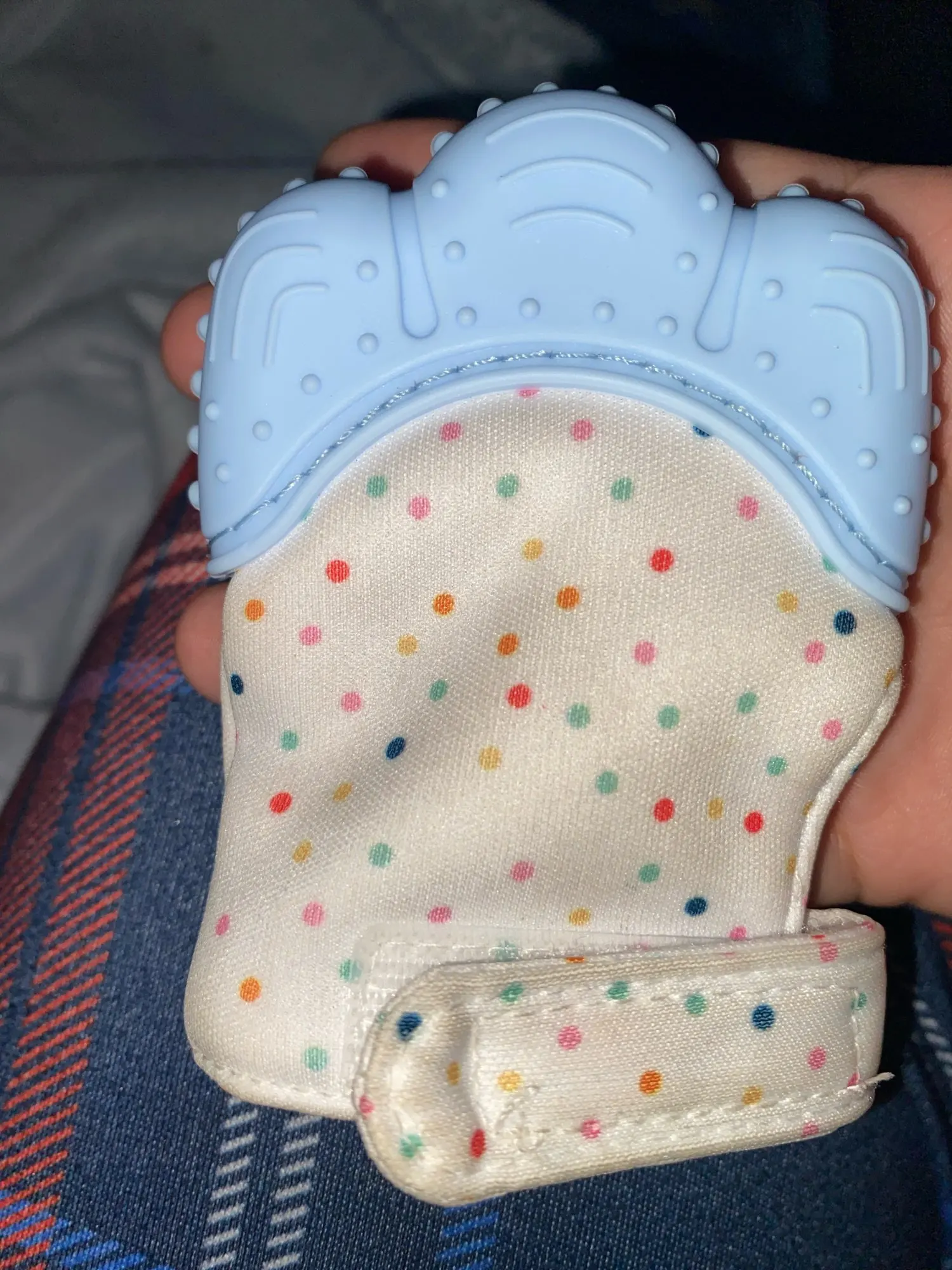These food-grade, BPA-free silicone gloves provide safe and gentle teething relief for babies aged 3–12 months. Their soft texture massages sore gums while keeping tiny hands protected and clean. Main Benefits Safe Material: Made from food-grade silicone, free from BPA and toxins. Soothing Texture: Gently massages and relieves gum discomfort. Sound Stimulation: Built-in squeak attracts attention and supports sensory growth. Protection: Prevents finger biting and facial scratches. Secure Fit: Adjustable strap keeps the glove snug and off the floor. Easy Care: Washable, durable, and ready for daily use. Technical Specifications Material: Food-grade silicone, BPA-Free, Cotton Color: Blue Age Range: 3–12 months Dimensions: 100 × 70 × 40 mm Feature: Squeaking sound What’s Included-1 × Silicone Teething Glove (Blue)