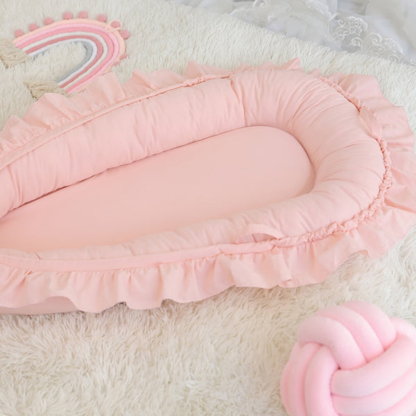 The Lace Cotton Baby Nest in soft blue-green is a cozy, portable bed for babies 0–3 years. Made from breathable cotton with raised edges, it mimics a womb-like space—ideal for sleep, play, or travel.