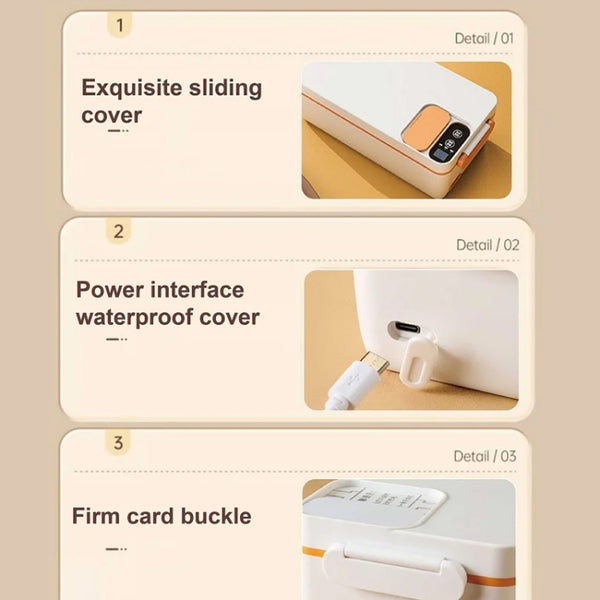 Key Benefits: Wireless Heating: Rechargeable 9600mAh battery, no plug needed 1L Capacity: Perfect for full meals at work, school, or outdoors Even Heating: 3D heating system warms food in ~1 hour Leak-Proof Design: Double-sealed lid, safe to carry Food-Grade Steel: 304 stainless steel liner, BPA-free, easy to clean Smart Display: LED screen + slide-to-lock switch